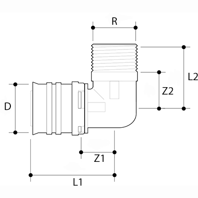 The male thread elbow adapter is a high-performance fitting designed for drinking water and heating system installations. Manufactured from dezincification-resistant (DZR) brass, it ensures durability and long-term corrosion resistance. The adapter conforms to DIN EN 10226-1 standards and features a white fixation ring with integrated inspection holes for accurate installation. It also includes a fixed stainless steel pressing sleeve, providing a secure and leak-proof connection. The leak-before-press function enhances installation safety by making unpressed connections easily detectable.