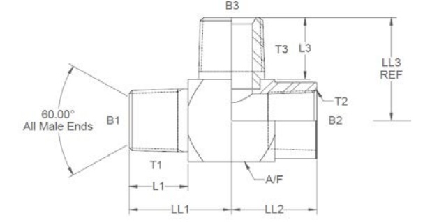 A robust 90° NPT tee with a male-to-female run and a male branch outlet, both male connections incorporating a 60° cone seat for secure metal-to-metal sealing. Engineered for high-pressure hydraulic and pneumatic applications, this tee ensures reliable, leak-free connections while withstanding vibration and repeated use. Precision-machined from high-quality steel to BS EN 10277 standards, it offers exceptional durability and a consistent, accurate fit.