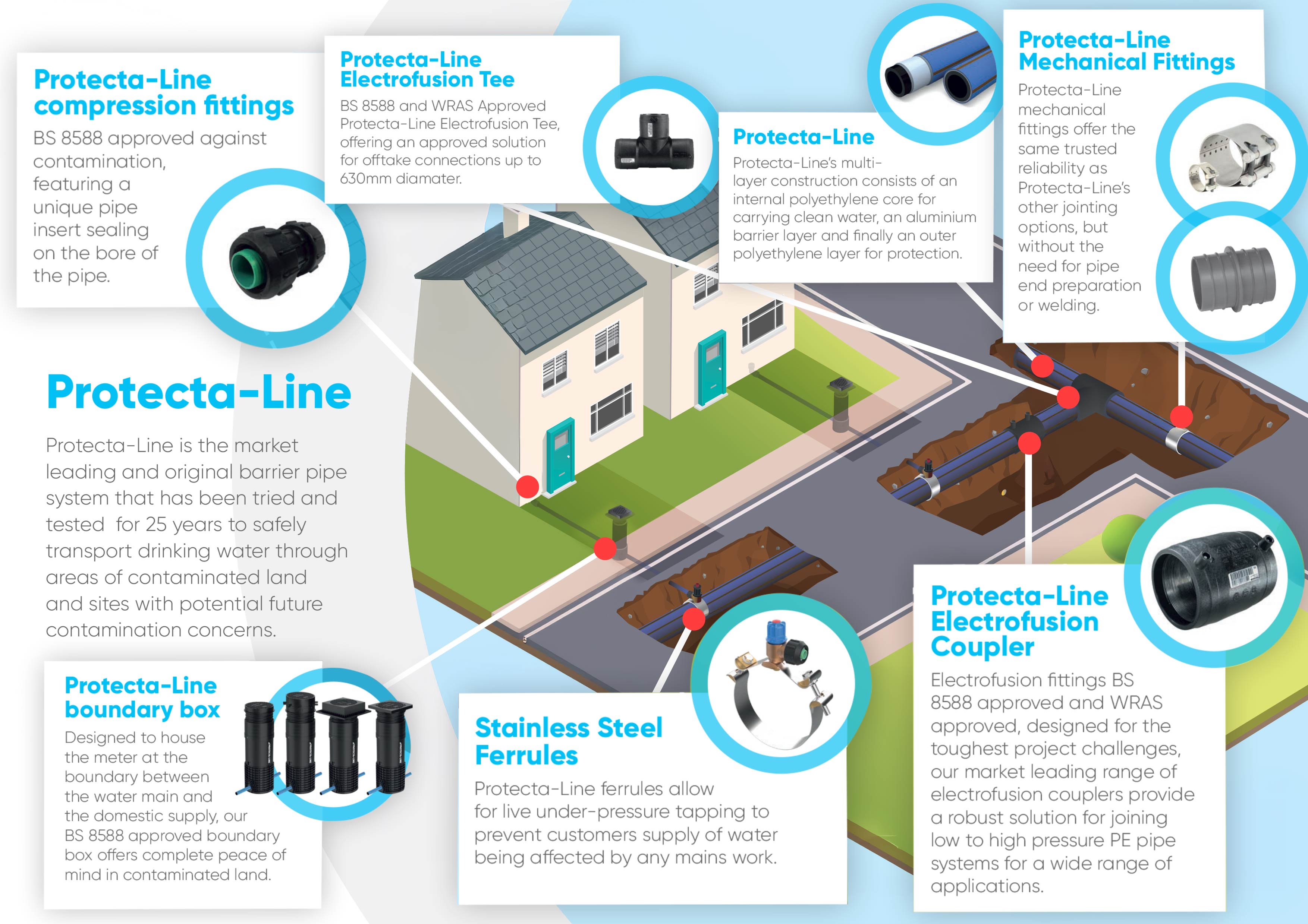 The MDPE barrier pipe we supply is Protecta-Line, manufactured by Aliaxis. It is the golden standard for UK water safety, holding many approvals and often specified for a project due to its known reputation. Protecta-Line conforms to the following approvals;