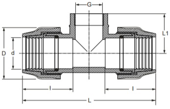 Three-Way Connection with Threaded Branch: connects two MDPE pipes and one BSP threaded fitting at a 90° angle.