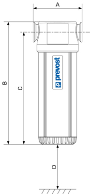 | SKU | Prevost Code | A (mm) | B (mm) | C (mm) | D (mm) | Female Thread (") | Flow Rate At 6 Bar (m³/h) |