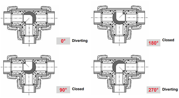 - 3-way L-port configuration: Allows directional flow switching between outlets while isolating the third port.