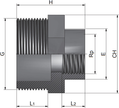| SKU | Nominal Size (inch) | Rp (inch) | G (inch) | L1 (mm) | L2 (mm) | CH (mm) | H (mm) | E (mm) |