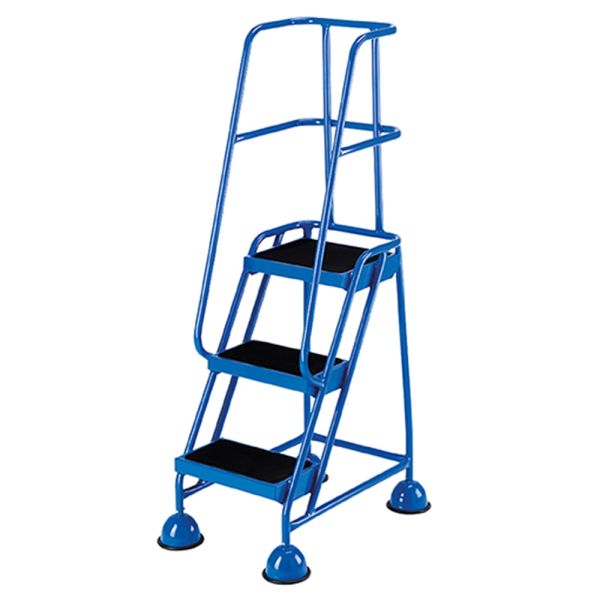 They have a handrail surrounding the platform and a non-slip rubber covering on the treads. They are fitted with spring castors that retract when weight is applied, lowering the rubber-footed dome covers for a firm contact to the floor.