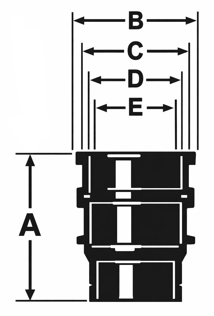 | SKU | Nominal Size (mm) | A Minimum (mm) | A Maximum (mm) | A (mm) | B (mm) | C (mm) | D (mm) | E (mm) |